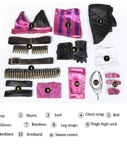 Included Items: Top, Shorts, Sash, Chest strap, Belt, Gloves, Bandeau, Leg straps,Thigh-high socks, Sleeve covers, Necklace,Armband